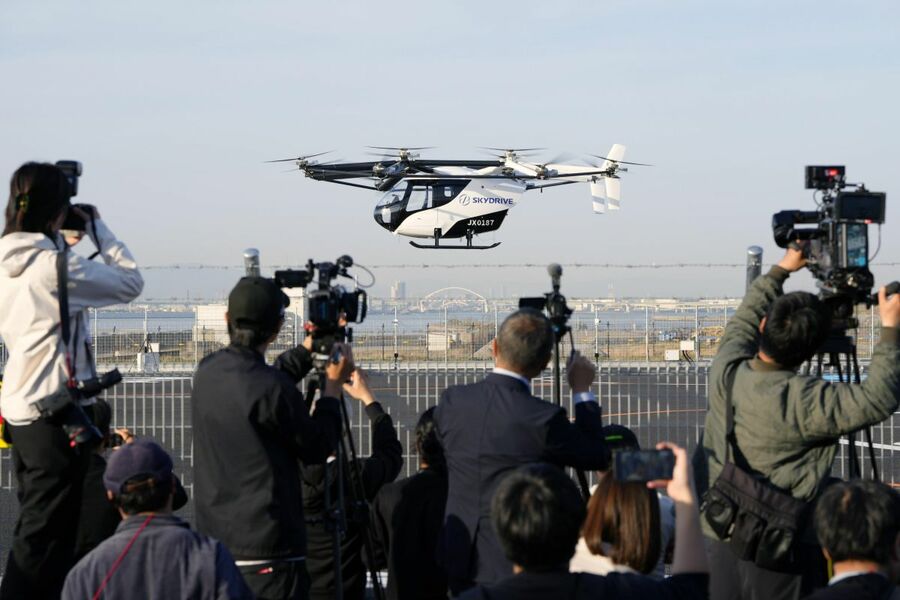 スカイドライブが大阪・関西万博に出展している空飛ぶクルマのデモ飛行(写真:共同通信社)