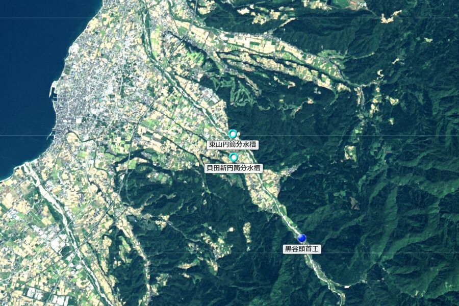 水源地の猫又山、東山円筒分水、富山湾の位置関係(国土地理院)