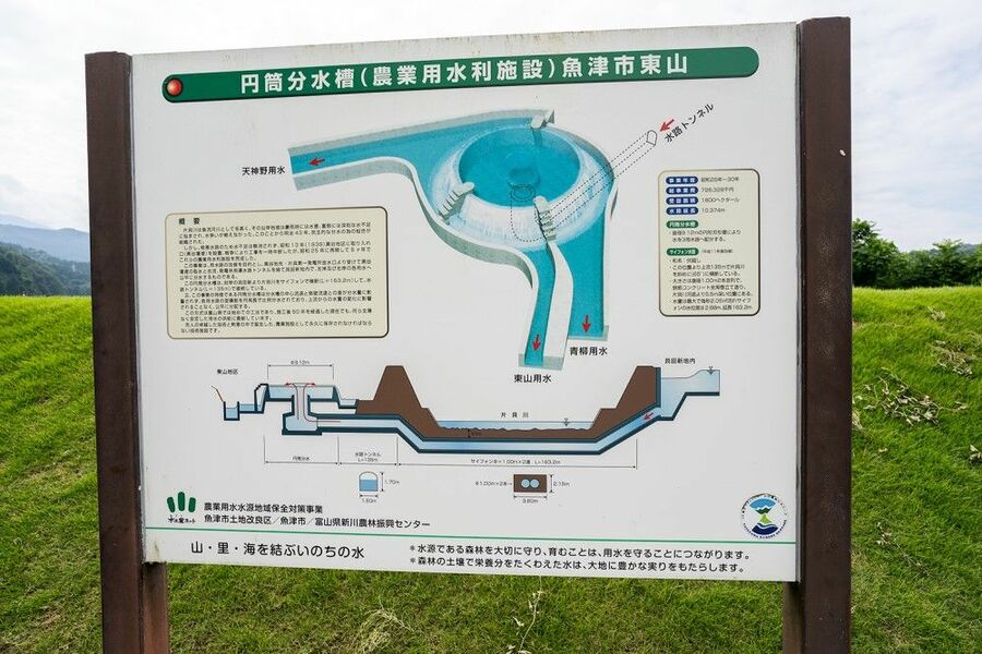 近くに設置された案内板では、片貝川をくぐって水が送られる仕組みを説明している