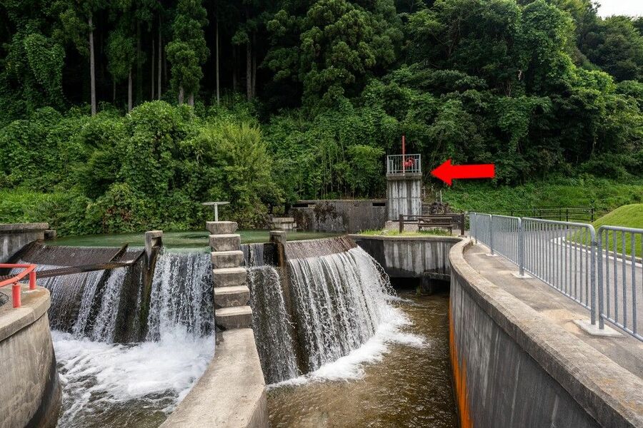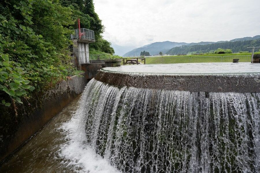 神秘的な吹き出し口のある貝田新円筒分水
