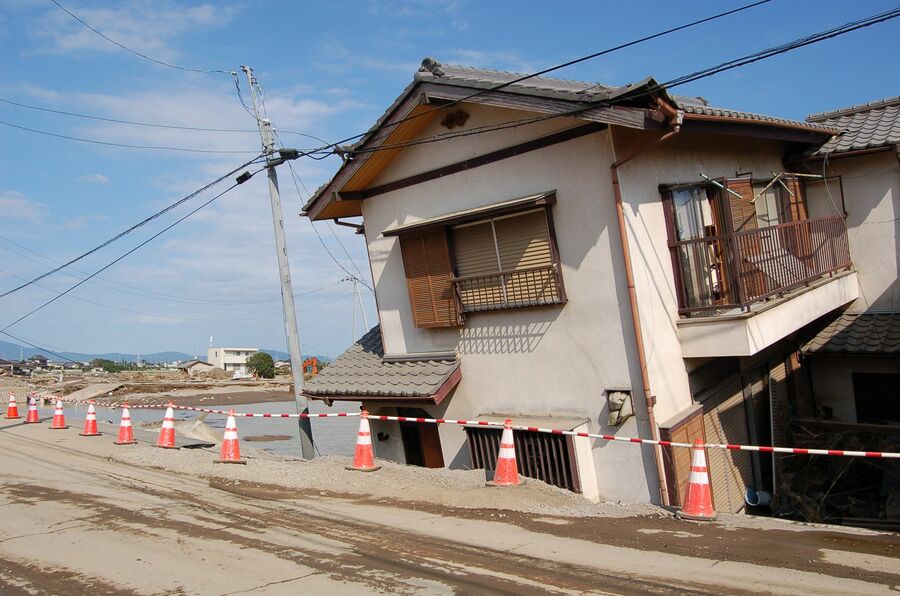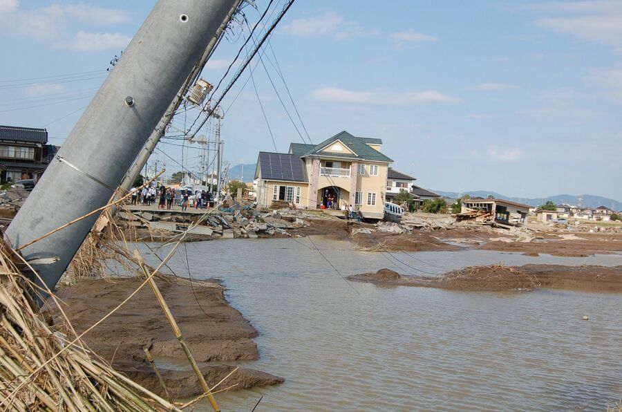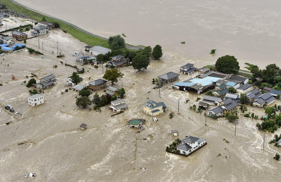 大雨で鬼怒川が氾濫し、決壊した堤防=2015年9月、茨城県常総市(写真:共同通信社)