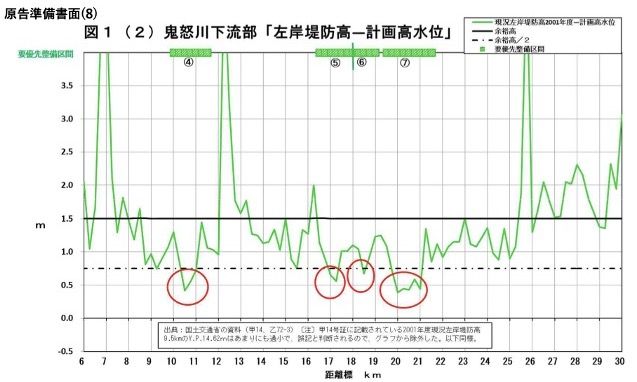 上三坂(左岸21.0km)の堤防が最も低かったことを示す証拠。横軸は鬼怒川と利根川の合流地点からの距離。黒線は堤防が完成した場合の高さ。緑線が実際の堤防高。点線が計画高水位(想定水位)。開示請求した国交省資料を元に作成され、2021年9月22日に水戸地裁に原告側が提出した嶋津暉之氏意見書(甲46号証)より。