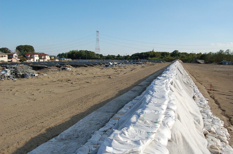 国が河川区域に指定して守るべき砂丘林(自然堤防)が、太陽光発電事業者により約200メートルにわたって削られ、無堤防状態だった若宮戸。写真奥が今も残る砂丘林。氾濫前は暫定堤防(写真中央)の左右にソーラーパネルが広がっていた(2015年10月31日、鬼怒川を右手に筆者撮影)
