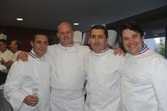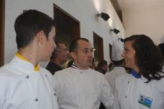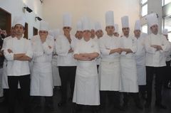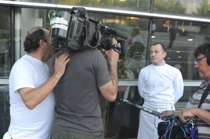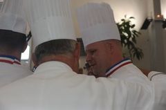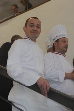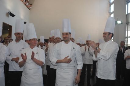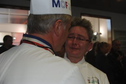 一番に名前を呼ばれ、トリコロール衿のシェフコートをまとったフロラン・ボワヴァン氏は、半世紀近く三ツ星を保持する名店 「ミシェル・トロワグロ」のスーシェフ。実技で助手を務めた生 徒たちの祝福を受け、フランステレビジョンのインタビューを受けるなど、引っぱりだこだ