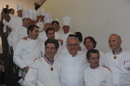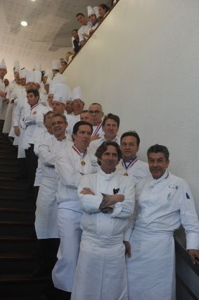 階段に勢揃いした審査員たち。トリコロールのリボンのメダルをかけているのはMOFのタイトル保持者。いずれも料理界、パティスリーの世界の実力者たちだ