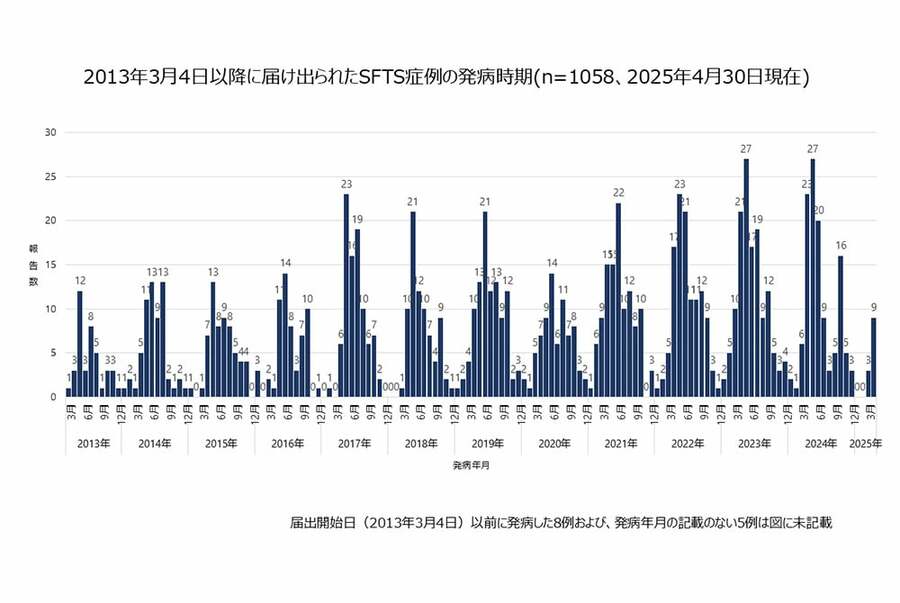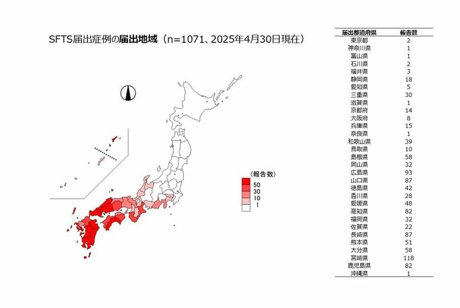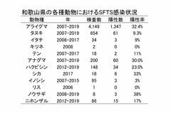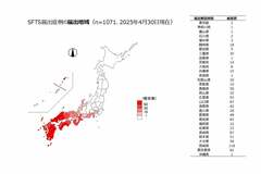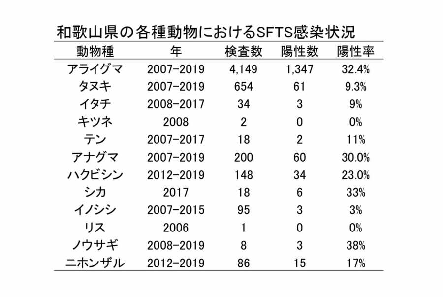 ネコ診療後に獣医師が死亡、致死率1割、西日本で約100例の感染例、マダニが媒介する感染症「SFTS」はなぜ危ないか? 野外で採取されたマダニ(写真:下田宙氏) (画像1/7) ひろ中央動物病院(広島県呉市)の玉原智史院長(写真提供:玉原院長) (画像2/7) 国内でのSFTS届出症例の地域分布(出典:厚生労働省) (画像3/7) 国内で2013年以降に報告されたSFTS症例の時期別の推移。春先と秋口にピークがある(出典:厚生労働省) (画像4/7) 年齢別のSFTS感染例数と死亡数(出典:厚生労働省) (画像5/7) 野外でマダニを採取する山口大学共同獣医学部微生物学教室准教授の下田宙氏(写真提供:下田氏) (画像6/7) 和歌山の野生動物でのSFTS抗体陽性率。過去にSFTSに感染したことを示す(表:国立感染症研究所 令和2年度動物由来感染症対策技術研修会資料) (画像7/7) ネコ診療後に獣医師が死亡、致死率1割、西日本で約100例の感染例、マダニが媒介する感染症「SFTS」はなぜ危ないか? この写真の記事を読む