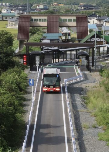 JR気仙沼線の柳津駅を出発するBRTのバス(宮城県登米市、2018年9月撮影/写真:共同通信社)
