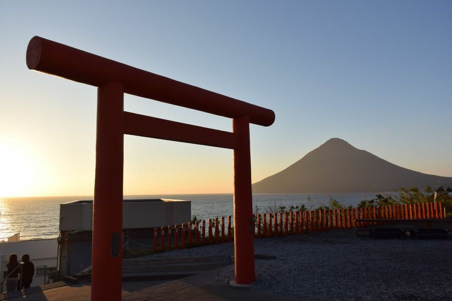 薩摩半島南端、長崎鼻の龍宮神社から開聞岳を望む(筆者撮影)