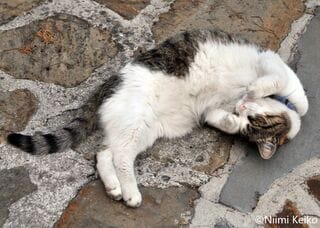 スロベニアの小さな町でのんびりと散歩する猫たち