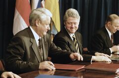 1994年12月5日、ブダペスト・コンベンションセンターで行われた核拡散防止条約(NPT)の調印式で、ロシアのエリツィン大統領(左)とアメリカのクリントン大統領(中央)が微笑み合う。右奥はウクライナのクチマ大統領(写真:AP/アフロ)