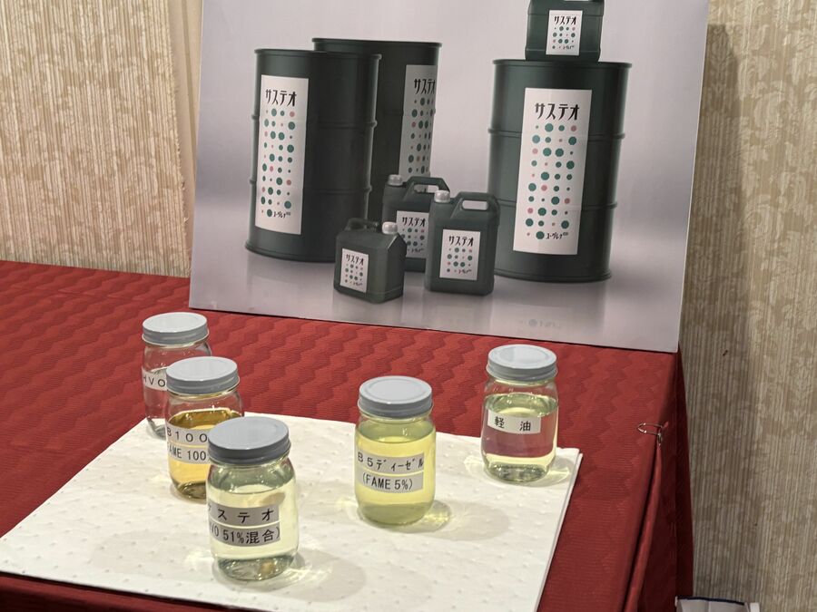 HVOを軽油に51%混合したユーグレナ「サステオ」の展示。軽油や各種FAMEなどと比べると色がかなり違うことが分かる(写真:筆者撮影)
