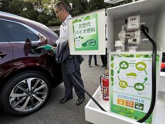 燃料供給関連企業の平野石油が独自開発した、次世代バイオ燃料給油装置を使い、マツダ「CX-60」への給油を模擬する様子(写真:筆者撮影)