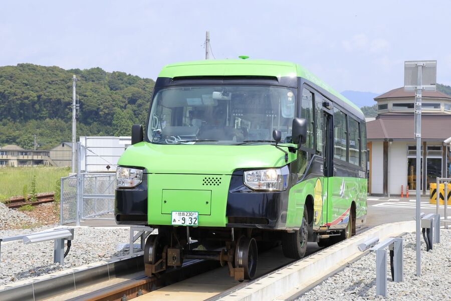 線路と道路の両方を走る阿佐海岸鉄道のデュアル・モード・ビークル、唯一無二だが33年連続赤字の乗り物を救うには? 一部区間では太平洋を望む絶景のなかを走るDMV。世界初の乗り物の成功例として今後も走り続けてほしい (画像1/7) 線路を走るときにはゴムタイヤの前後に鉄車輪が出て、後輪のゴムタイヤで駆動する (画像2/7) 道路を走るときは普通のボンネットタイプのマイクロバスと変わりない。ベース車はトヨタのコースターだ (画像3/7) (画像4/7) (画像5/7) 道路から線路を走る際におこなわれるモードチェンジ。ボンネットの下から鉄車輪がでてきて、前輪のゴムタイヤが浮き上がる (画像6/7) 運転席。普通のバスよりはスイッチ類などは多い。線路走行時にはハンドル操作はおこなわない (画像7/7) 線路と道路の両方を走る阿佐海岸鉄道のデュアル・モード・ビークル、唯一無二だが33年連続赤字の乗り物を救うには? この写真の記事を読む