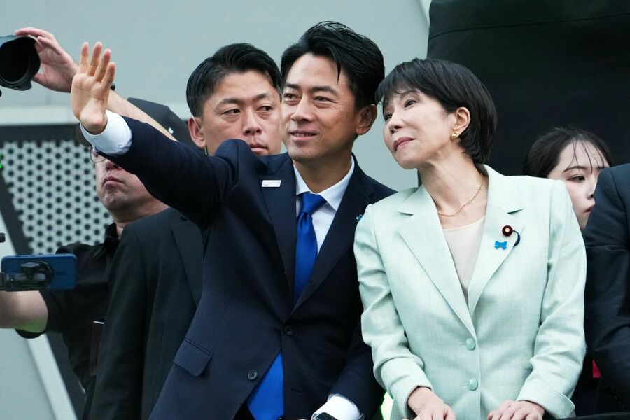 2025年9月24日、東京・秋葉原で選挙活動を行った自民党総裁選候補の5人(左から小泉進次郎農相、高市早苗前経済安保相、林芳正官房長官、茂木敏充前幹事長、小林鷹之元経済安保相/写真:アフロ)