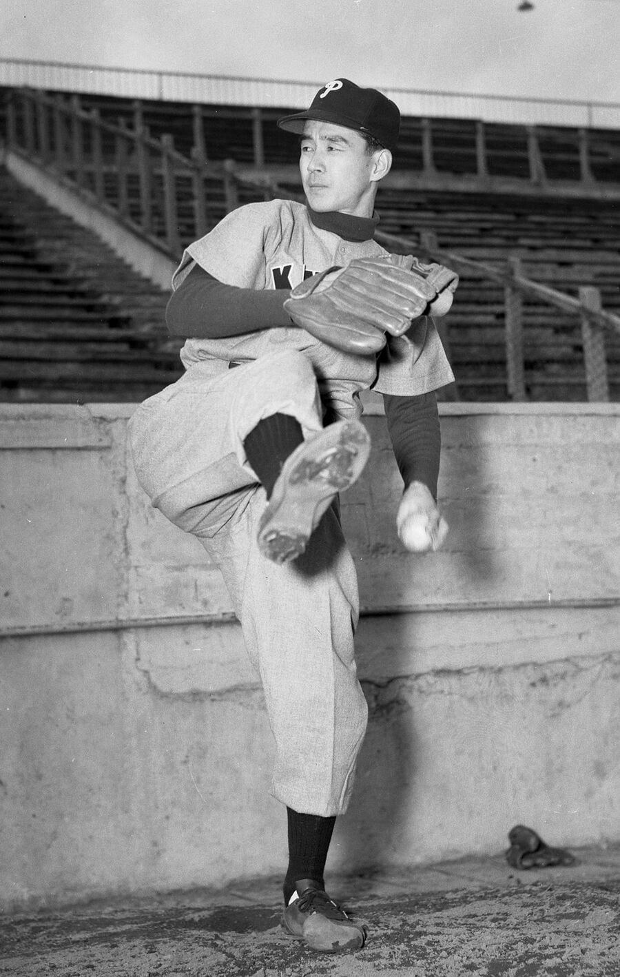 1957年、近鉄時代の関根潤三の投球フォーム(写真:共同通信社)