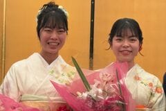 N/S高校囲碁タイトル獲得祝賀会にて、上野愛咲美女流名人(左)と上野梨紗女流棋聖(2025年2月、筆者撮影)
