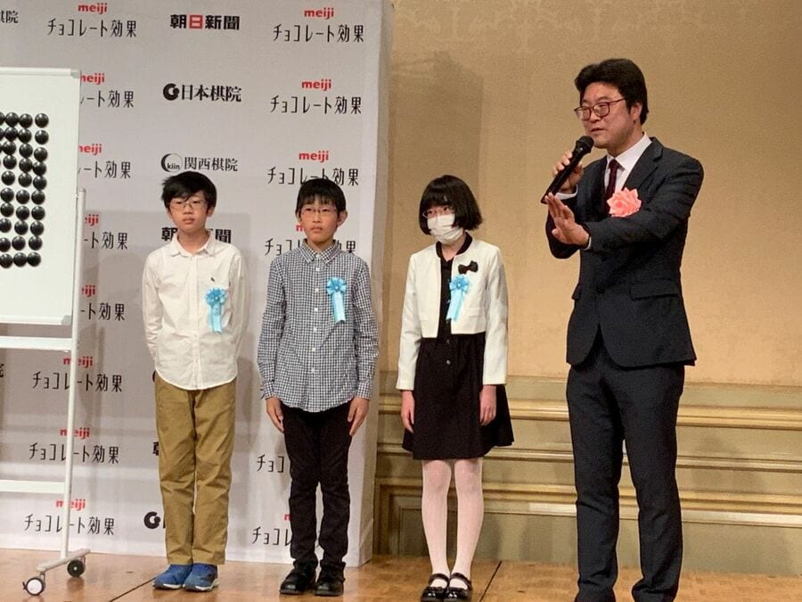 芝野虎丸名人就位式にて、道場の子どもたちとお祝いに駆けつけた洪清泉四段(右)(2023年12月、筆者撮影)