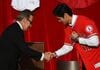 2006年3月、第1回WBCで優勝を達成し、笑顔で会見に臨む日本代表チームの王貞治監督(左)とMVPの松坂大輔=ペトコ・パーク(写真:共同通信社)