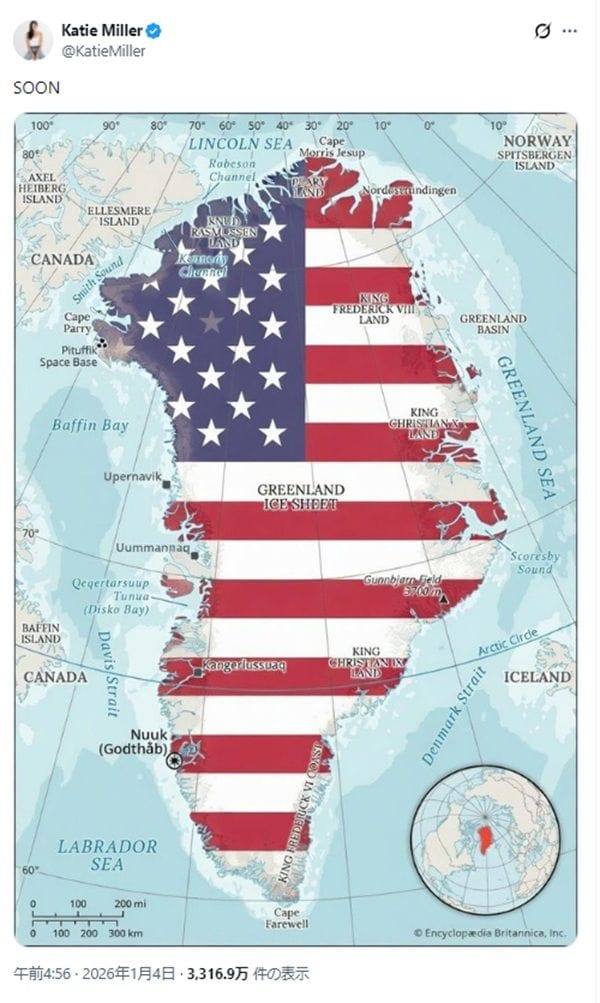 ベネズエラの次はグリーンランド、米国の「トランプ帝国化」を側近たちは礼賛・同調、底知れぬ欲望に戦慄する欧州 トランプ大統領(写真:ロイター/アフロ) (画像1/4) 米国のスティーブン・ミラー大統領次席補佐官(写真:AP/アフロ) (画像2/4) 第1次トランプ政権で副大統領報道官だったケイティ。ミラー氏がXに投稿した星条旗のデザインで埋め尽くされたグリーンランドの地図(ケイティ・ミラー氏のXより) (画像3/4) トランプ大統領が取得を主張するグリーンランド(提供:共同通信社) (画像4/4) ベネズエラの次はグリーンランド、米国の「トランプ帝国化」を側近たちは礼賛・同調、底知れぬ欲望に戦慄する欧州 この写真の記事を読む