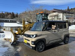 長野周辺で除雪車の隣にて。「デリカミニ」の助手席にはいつも「デリ丸。」(写真:筆者撮影)
