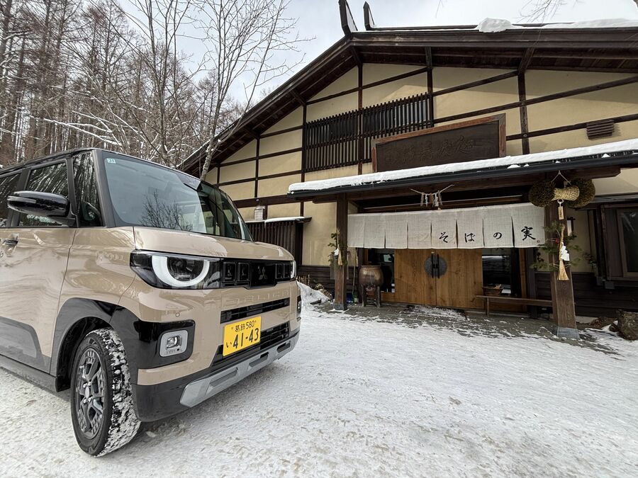 戸隠高原の蕎麦店の前にて。周辺は圧雪路だった(写真:同乗者撮影)