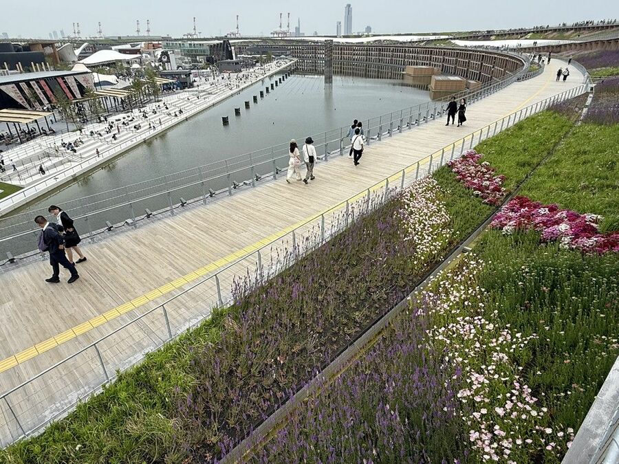 「⼤屋根リング」上の風景。ダイナミックな眺望の傍らに草花が咲く。設計/藤本壮介、忽那裕樹、東海林弘靖、東畑・梓設計JV、⼤林組、清⽔建設、竹中工務店(写真:⾼⽊伸哉)