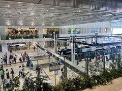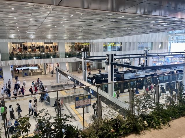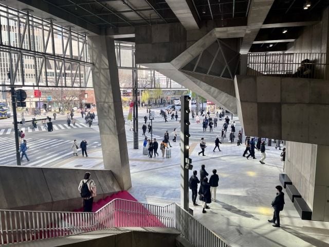 「雁木テラス」から路面電車のりばを見下ろす。フェンスも視界を遮らないガラス張り。「広島駅南⼝ビル」設計/⻄⽇本旅客鉄道、ジェイアール⻄⽇本コンサルタンツ、東畑建築事務所、SUPPOSE DESIGN OFFICE、⼤林組、広成建設(写真:萩原詩子)