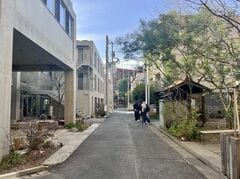 「ニシイケバレイ」。写真左側が新築の「TELAS」、道路を挟んで右側に木造平屋を改修したカフェ「Chanoma」がある。おのおのの敷地前面の石畳や植栽が境界線を曖昧にする。設計/須藤剛建築設計事務所(写真:萩原詩子)