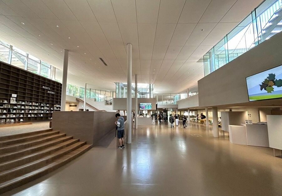 「東海国⽴⼤学機構Common Nexus」地下のパサージュ。本棚とソファのある「ROOTS BOOKS」や売店、キッチンやギャラリーなどが並ぶ。設計/⼩堀哲夫建築設計事務所(写真:飯⽥彩)
