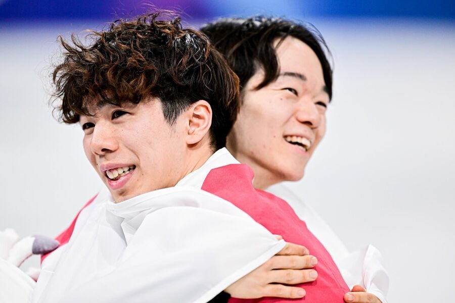 2026年2月13日、ミラノ・コルティナ五輪、フィギュアスケート男子、鍵山優真(右)が銀、佐藤駿が銅メダル 写真/Raniero Corbelletti/アフロスポーツ