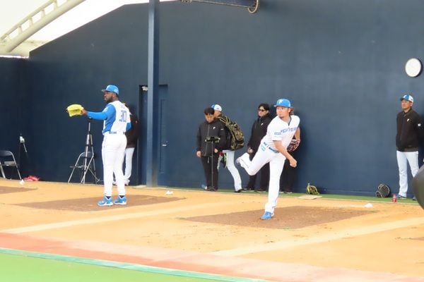 ブルペンで投げ込みをする新外国人投手のサウリン・ラオと伊藤大海(筆者撮影)