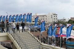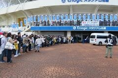 強風が吹く中、続々とファンが球場に吸い込まれていく(筆者撮影)