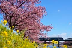 満開の河津川を渡る「サフィール踊り子」。色のコントラストが映えすぎる