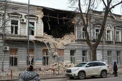2月21日、ウクライナのオデーサで、ロシアのドローン攻撃を受けた高等学校を見つめる住民たち(写真:ロイター/アフロ)