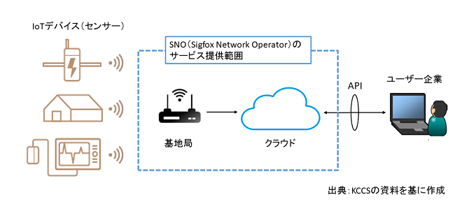 SigfoxがLoRaと決定的に異なる点は、Sigfoxによる無線データ通信のサービス事業者が原則として「一国・一社」になっていることである。シグフォックスと提携して各国でサービスを提供する事業者「SNO(Sigfox Network Operator)」が、基地局となるゲートウェイからネットワークサーバー(クラウド)までを一手に整え、ユーザー企業に提供する。