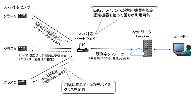 特定小電力無線、無線LAN、Bluetoothは通信距離が短く、広い範囲に分散した機器の通信に用いるのにはあまり向いていない。逆に、3G/4G携帯電話網はある程度長い距離の通信が可能だが、大容量データの送受信が常時求められない場合は、オーバースペックになりがちだ。機器への機能搭載や回線利用に要するコストが高いことに加え、消費電力が大きいなどの課題があるため用途は限られる。