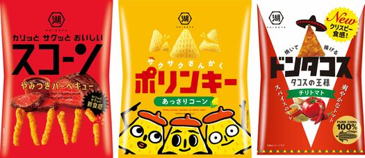 1975年、カルビーがポテトチップス市場に参入したことを機に、湖池屋はポテトチップス専業から総合スナック菓子のメーカーへと転身し、社業を拡大していく。こうしてコーンスナックのロングセラー商品・「スコーン」、「ポリンキー」、「ドンタコス」が誕生することになる(写真は現在の商品)