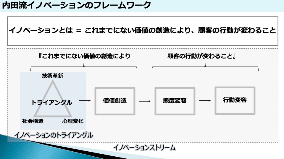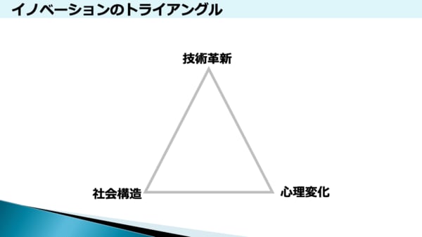 内田氏は「イノベーションのトライアングル」というフレームワークを考案している。トライアングルのいちばん頂点には「技術革新(テクノロジー)」、左下に「社会構造」、右下に「心理変化」というキーワードが置かれている。