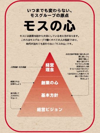 “モスの心”は、まず「人間貢献・社会貢献」を経営理念とし、「感謝される仕事をしよう」が創業の心で、「食を通じて人を幸せにすること」を経営ビジョンと定めている。そして時代がどのように変化しようとも、モスフードサービスの役員、幹部、社員にとどまらず、店舗スタッフも含めて共有すべきものが基本方針だ。