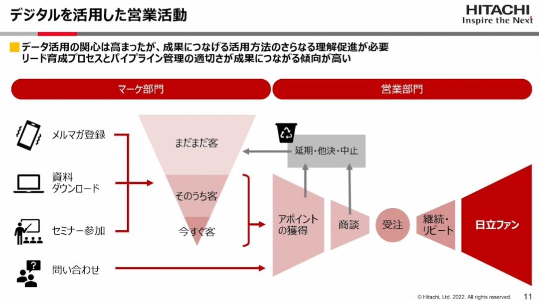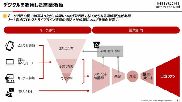 「見込み客を『まだまだ客』『そのうち客』『今すぐ客』に分け、その中でもある程度、感度の高い顧客のデータを営業に渡します。営業はそれをもとにアポイントを取り、商談を行うといった流れです。もちろんお客さまによっては、アポイントを取ってもまだ検討する時期ではなかったり、現時点で予算がなかったりして、われわれの提案したものがうまく受注に結び付かないケースもあります。しかし、お客さまとの関係がそこで切れるわけではありません。日立グループはさまざまな事業を行っているので、また別のタイミングに、別のソリューションでお客さまと関われることもあります。そのため、いったん商談が延期・中止になったお客さまのデータは『まだまだ客』に戻し、別の機会に接点が持てるようにしています」
