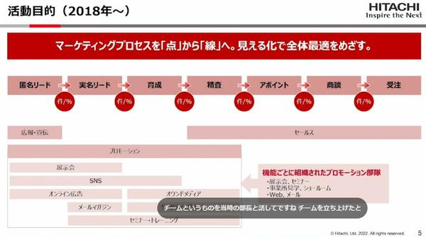 日立製作所は、2018年にデジタルマーケティングのチームを立ち上げた。デジタル活用の体制や基盤をつくる上で同社が目標としたのは、マーケティングプロセスを「点」から「線」へつなげて見える化することだった。
