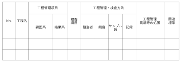また、エピソードのB社の事例から分かるように、QC工程表の役割の1つは、製造工程の品質管理方法を標準化し、運用を徹底することである。QC工程表で一連の工程において骨子となる方法を定め、詳細手順を作業標準や検査標準などの標準類を定める。そして現場は、その標準類を基に作業を行うことが多い。B社のように、QC工程表の要素と工程内検査の検査標準の要素を統合することは、現場での運用の効率性を高める工夫の1つと言える。