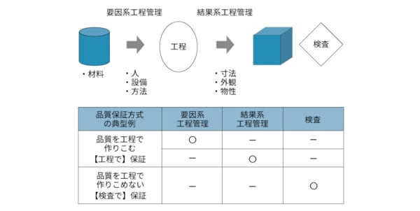 2つ目は、要因系の管理項目だけでは不適合が発生しないことを保証できない場合に、結果系の管理項目を定め、製造工程に問題ないことを監視し、問題の兆候があれば制御する方式である。