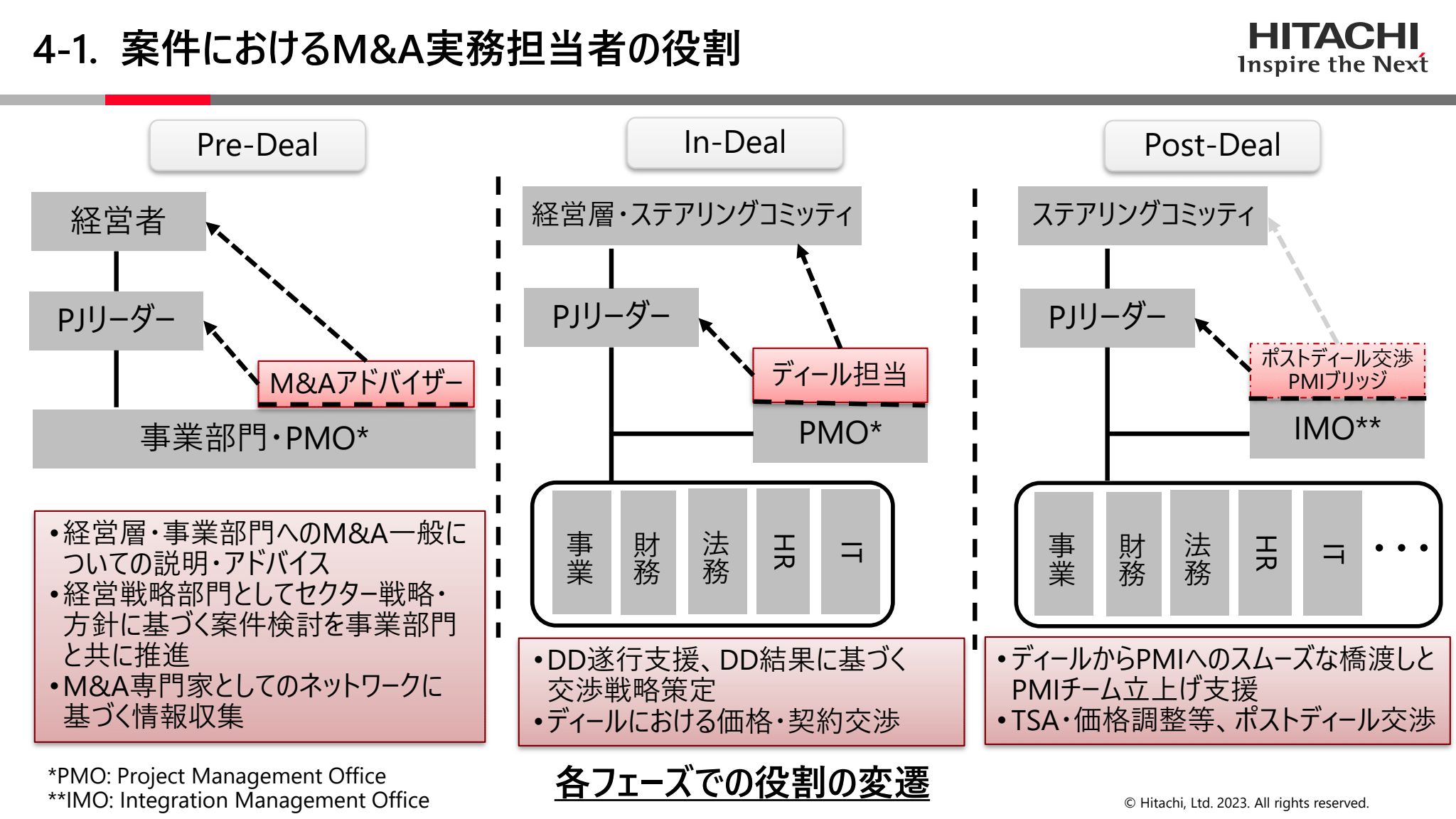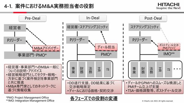 案件ごとに差はありますが、フェーズによって役割は変わっていきます。対象会社を探しているPre-Dealでは事業部門や経営層に対して、M&A一般について説明、アドバイスするアドバイザーとしての役割が強かったと思います。その後、実際に対象会社を決めてアプローチし、交渉が始まるIn-Dealでは、DD(Due Diligence:M&A対象への詳細な調査)遂行のアレンジや交渉戦略策定、実際の価格・契約交渉を主に担当します。また、売り手と契約合意し、案件発表をするとPMIに向けた活動が本格化します。ここでは事業部門や管理部門のワーキングチームの役割が大きくなります。このPost-Dealでは、DealからPMIへのスムーズな橋渡しが主な仕事ととなります。また、売り手との間ではトランディテョンサービスアグリーメント、価格調整など、Post-Dealの交渉も残っています。