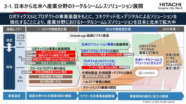 JR オートメーションテクノロジーズ社の事業をデジタルレイヤーにつなぎ、日立が買収する意義のある会社を探すのはかなり大変でした。この会社もそれほど規模は大きくありませんが、製造ラインと経営層のインターフェースとなるERPを製造実行システムや監視制御システムでつなぐことができる、優良な顧客基盤を持っています。この買収により、日本だけでなく北米でも日立のトータルシームレスソリューションをさらに進化させていきます。