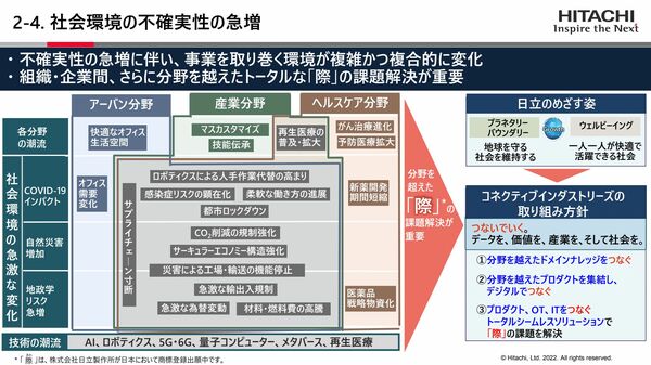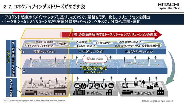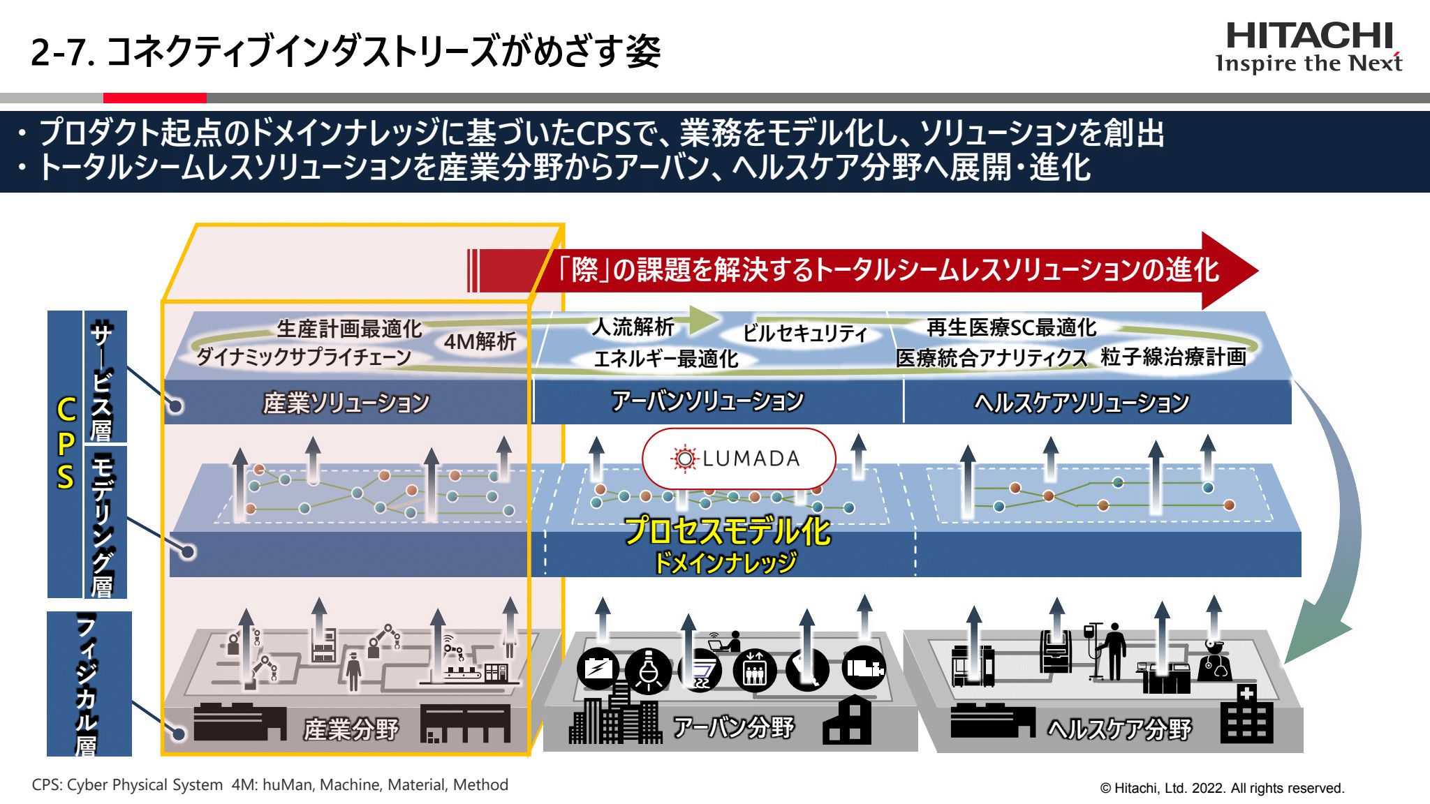 また、日立が標榜する「LUMADA(ルマーダ)」は、顧客のデータに光を当て、その経営課題をデジタルの力でともに解決していくフレームワークです。そこにさらに長年のプロダクトの事業の中で蓄積したドメインナレッジを加え、単にモノやサービスがあるだけではつながらないギャップをつなげています。特に昨今の複雑かつ複合化する課題に対しては、アーバン、ヘルスケア、産業などの分野間で連携して、さらにつながる「場」を提供することが重要となってきています。