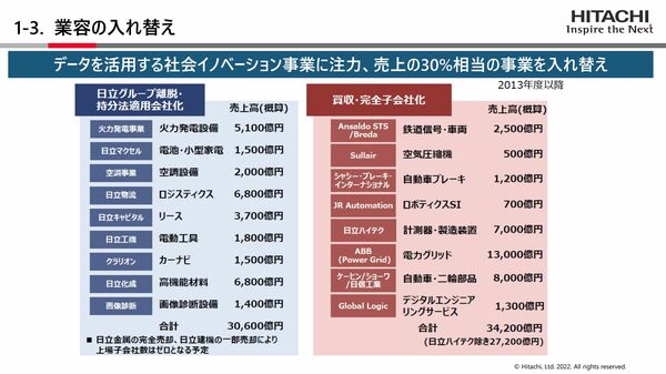 日立グループはこれまでの事業ポートフォリオの見直しを通じて、2021年度末までの10年間で実に約30%相当の事業入れ替えを完了しています。データ活用をした社会イノベーション事業と距離があると判断した事業をカーブアウトする一方、約3兆円もの事業を買収、または取り込んでいます。このほか、2022年度には日立建機の株式一部譲渡を8月末に完了し、さらに約1兆円を切り出しました。また、まだ完了はしていませんが完全売却を予定している日立金属も9400億円、今年(2023年)3月末に発表した自動車部品の合弁事業・日立Astemoはマイノリティ化で4400億円の売上をそれぞれカーブアウトする予定です。これによって2013年以降は、合計で5兆円以上、日立グループの約50%の売り上げを入れ替えることになります。