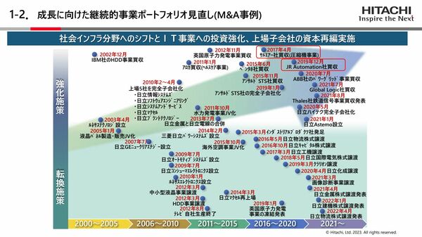 現CEOの小島啓二はIT分野の研究をバックグラウンドとしていますが、小島自身、さまざまな事業ポートフォリオの見直しを経験してきています。日立はスイスの重電大手ABB社のパワーグリッド事業や米国IT大手のグローバルロジック の買収など、近年、大型のM&A案件を取り上げられることが多いですが、この一方で2000年代から継続的に事業ポートフォリオを見直し、半導体や液晶事業を段階的に外部化してきました。リーマン・ショック後には日立史上最大の赤字を出しましたが、ポートフォリオの整備は継続しました。中でも2002年にIBM社から買収したハードディスク事業は黒字化したものの、日立の目指す社会イノベーションとは異なる事業であると判断し、売却を進めました。3400億円超えの、当時の日立としては最大の取引でした。