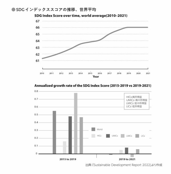 2022年のレポートで示されたSDGインデックススコア(17のSDGsに関する各国の全体的な実績を評価したもの)の状況を見ると、2015年から2019年にかけては、2030年の達成目標に向けては不十分だが、それでも世界全体で年平均0.5ポイントの割合でスコアを伸ばしてきたことがわかる。ところが2019年から2021年は全世界でのコロナ禍の影響による経済的な混乱で、SDGインデックススコアは世界全体で0.01ポイント減少し、特に低中所得国での悪化が大きく、2030年までの達成に暗雲が立ち込めている。