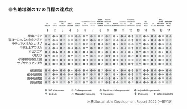 また、下表に示すように各地域別の17の目標に対する達成度をみても、2飢餓をゼロに、14海の豊かさを守ろう、15陸の豊かさを守ろうで多くの国とエリアでチャレンジが必要な状況が続いている。